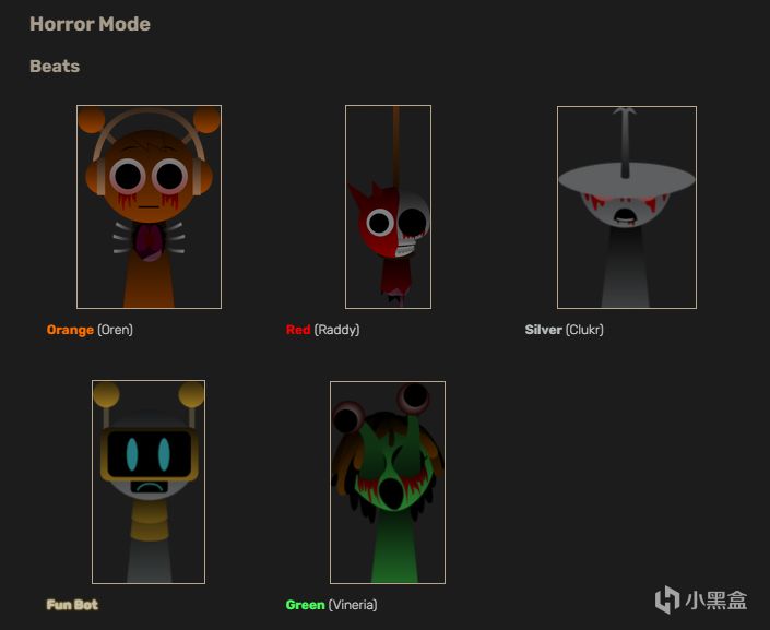 Sprunki模组有两种模式,如果不去碰“黑色礼帽”,那这款模组就还是一个友好的儿童画风音游。但如果使用那顶黑色礼貌,游戏就会进入恐怖模式——在这个模式中,每个人物形象都会产生特殊的变化。他们或是精神错乱,或是浑身冒血,而诞生的音轨也全都嘈杂无比,彻底进入了恐怖片现场。