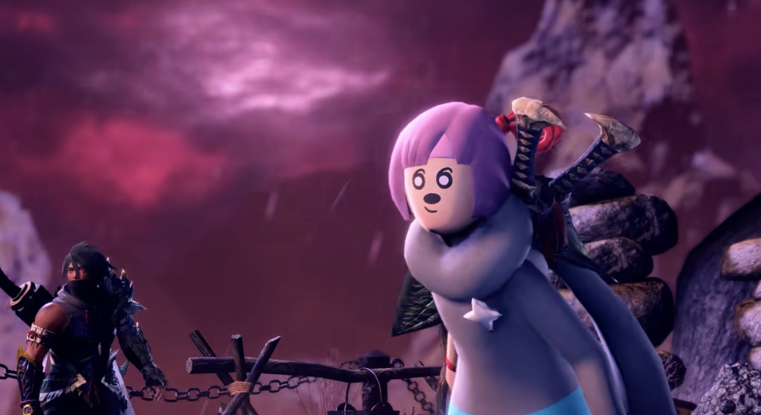 等游戏推进到后期,在狩猎岚龙前,还有一段过场动画。NPC互诉衷肠,主角救场正面迎战岚龙……前脚还沉浸在两个人互相依偎的温情戏里,后脚就看着抽象杀马特从天而降迎战巨兽。