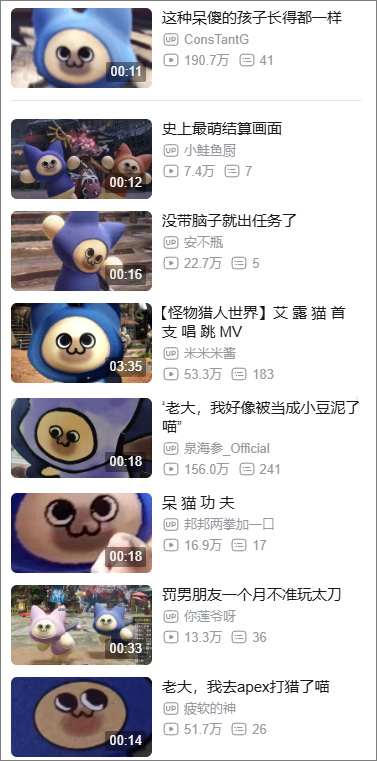 在B站搜索栏,甚至不用打出“呆猫”这个昵称,只是把它对猎人的称呼“老大”打进搜索框,眼神清澈的呆猫就会堆满整个页面。