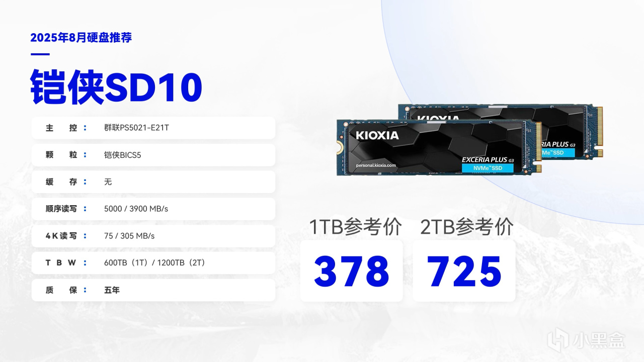 说到亲民的价格,那就不得不提一嘴,铠侠的 SD10,它的价格足够便宜,速率方面属于是PCIe4.0中速盘,相较于前面推荐的几款硬盘,价格会更便宜一些,顺序读写分别为5000MB/s以及3900MB/s,依旧是作为一款无独立缓存设计的硬盘。