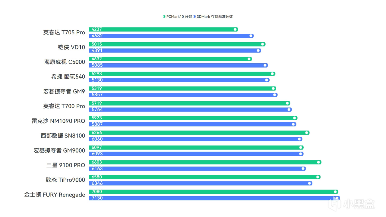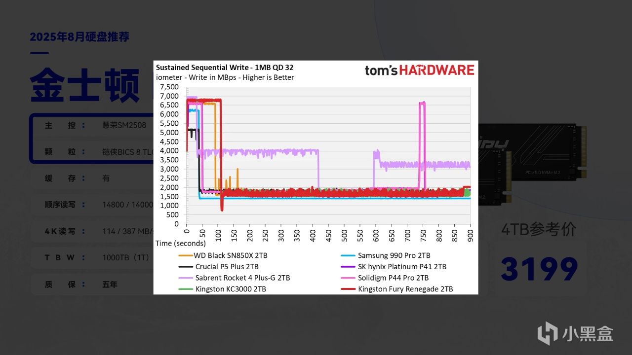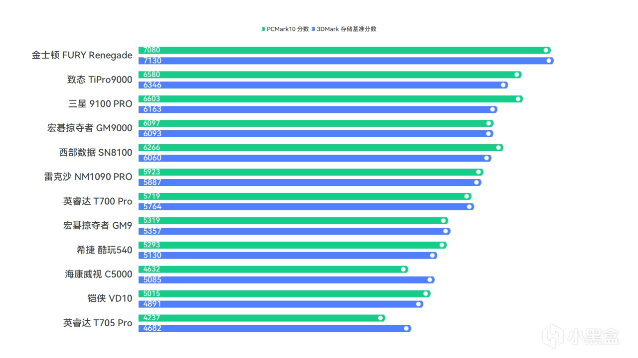 回到我们的实测天梯图中可以看到,有这么一款硬盘的理论跑分可谓是一骑绝尘,更甚至是超过了诸如致态、三星、西数等原厂盘,没错就是这款金士顿的FURY Renegade。