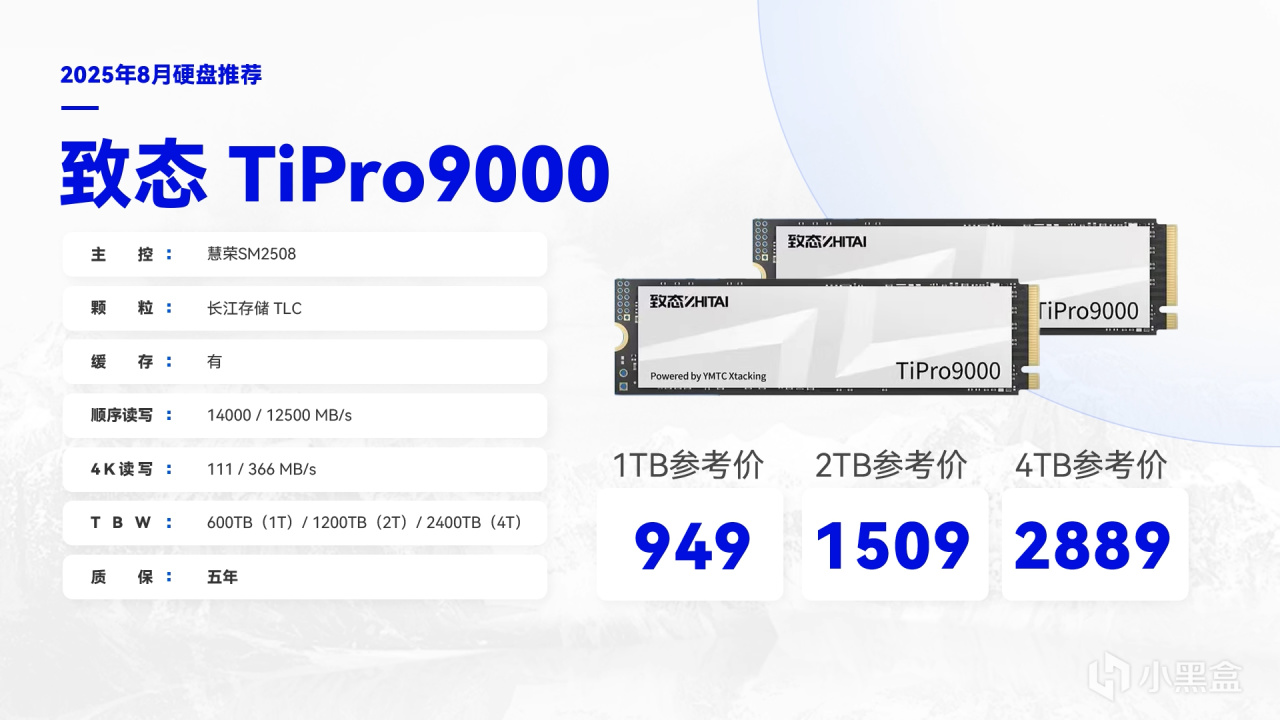 紧接着,你也可以看看采用原厂颗粒的致态 TiPro9000,主控并没有采用之前一直在用的联芸,而是选择了慧荣SM2508,先进的国产X4 9070闪存颗粒,为其也带来了不错的TLC 直写速度,但是在SLC Cache策略上,略微保守了些,2TB只有292G,不过其价格在相较于此前,是有所下降,放在一众原厂盘中,它的价格是相当的低了,个人首推是2T和4T版本。