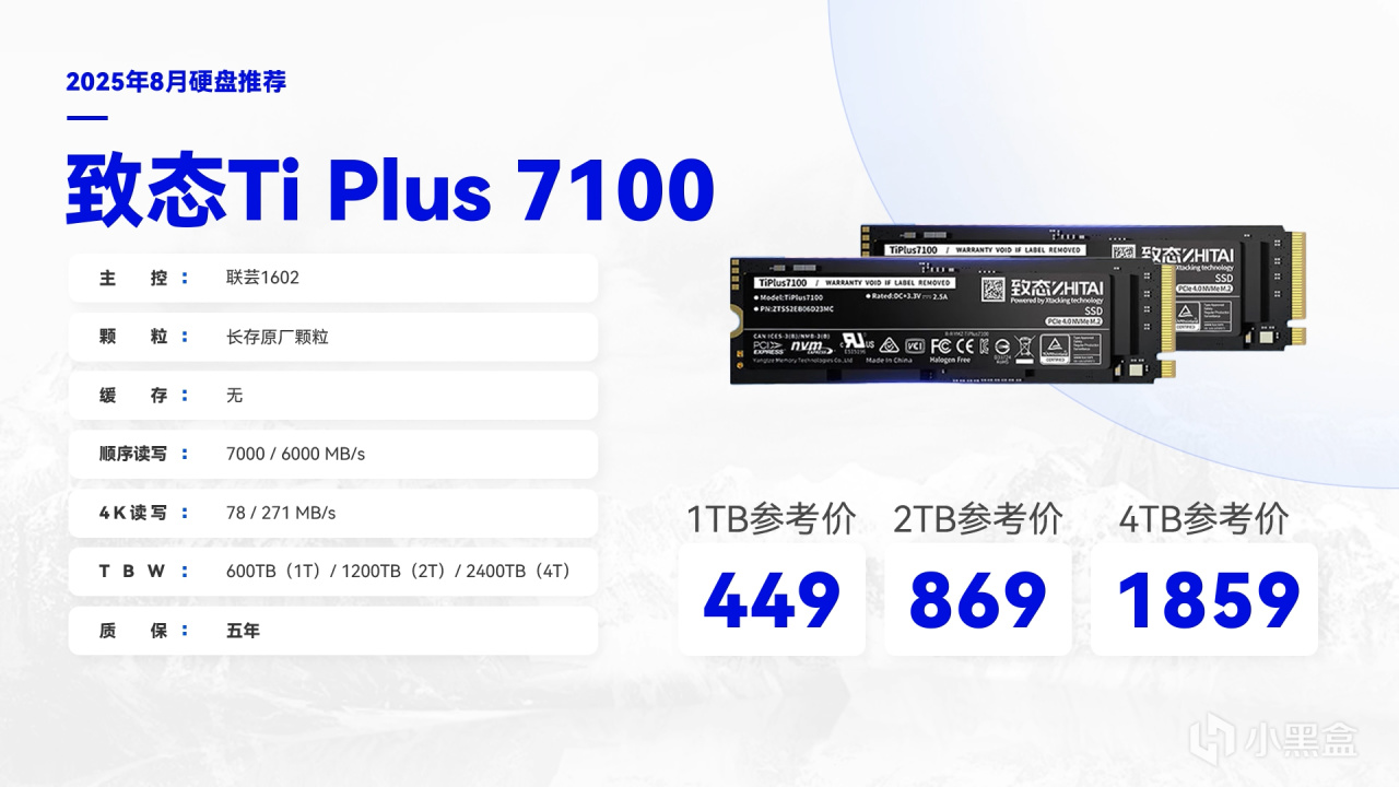 OK,废话说得有点多了,现在要推荐的是采用国产颗粒的致态 TiPlus7100,作为当初硬盘价格的搅局者,它采用的是长江存储原厂TLC颗粒,质量方面是有保障的。