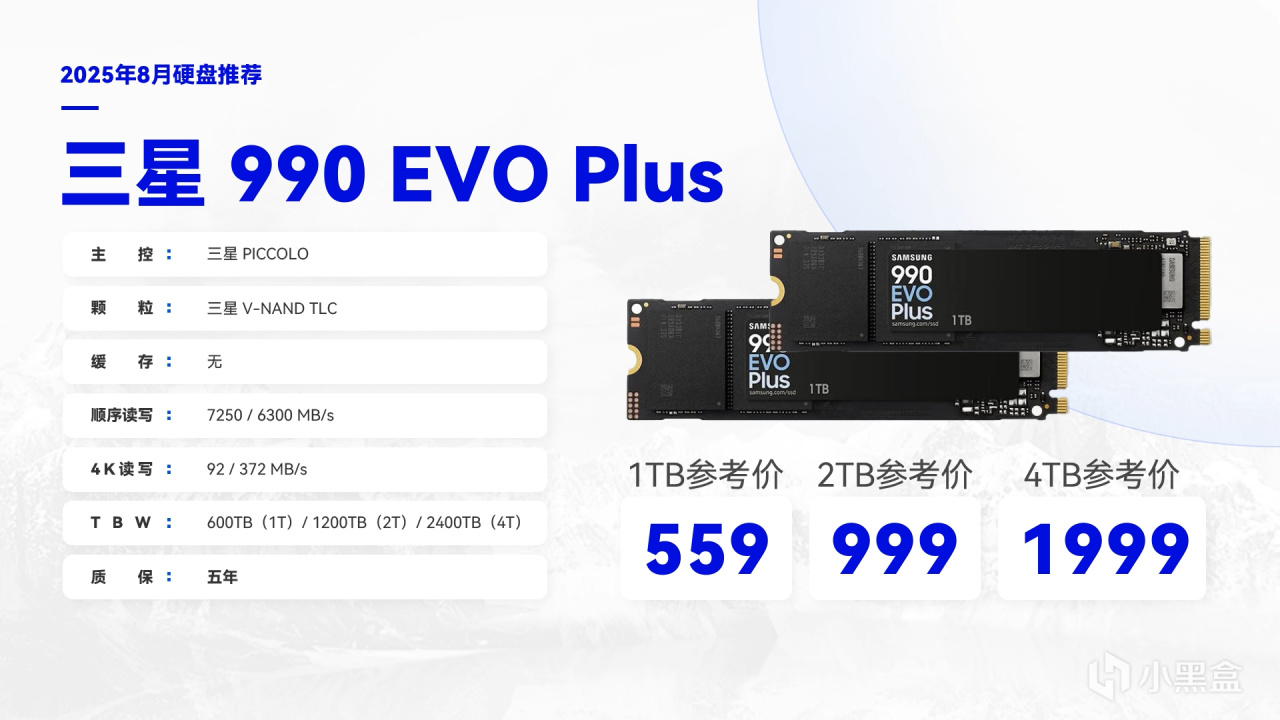接着,可以看看三星990EVO PLUS,去年末出的一款无缓旗舰,作为三星PCie4.0速率的新品,采用的无独立缓存设计,因此它的温度表现是非常不错的,其价格方面相较于之前出的那些盘来说,相当的亲民了,如果说你考虑对笔记本进行加装,它也是个不错的选择。