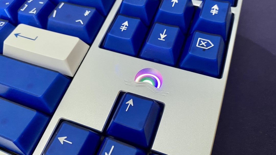 正面沒有過多的修飾,合適的邊框寬度,以及不漏軸的設計就已經說明這把鍵盤的外觀設計不錯,唯一的裝飾在方向鍵的正上方有一個日落主題的RGB燈使得正面不會過於平庸。