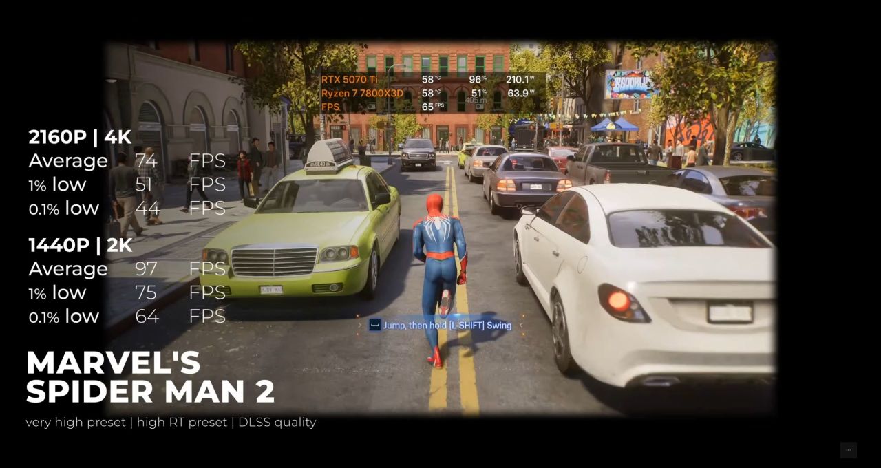 在蜘蛛侠2的表现中,4K分辨率下平均帧数为74FPS,显卡温度稳定在58度左右,CPU温度稳定在58度左右