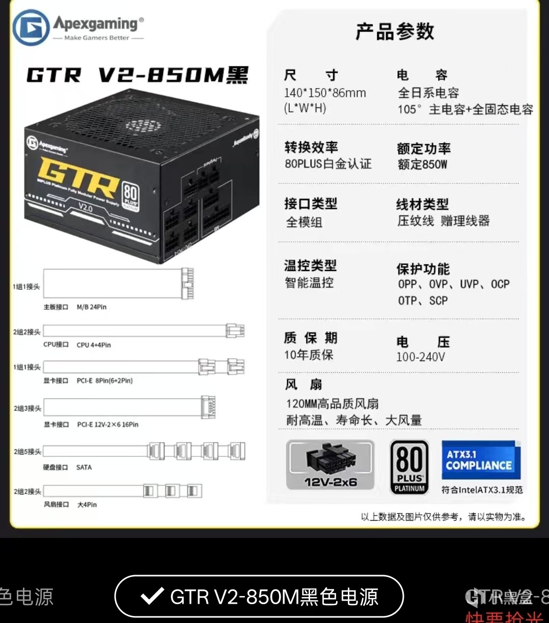 ㅤㅤ白金认证全模组,ATX3.1新标准、原生PCIE5.1全日系电容,性价比还是很不错的,十年质保支持个人送保,如果没这么高的配置如7800x3d+9070xt,可以向下逐级750w、650选择,650w的是gti系列的。