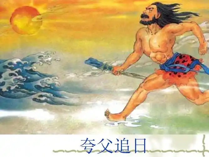 夸父逐日出自中国上古奇书《山海经》,相传在黄帝王朝时代,夸父族首领想要把太阳摘下,于是开始逐日,和太阳赛跑,在口渴喝干了黄河、渭水之后,在奔于大泽路途中渴死,手杖化作桃林,身躯化作夸父山。夸父逐日的故事,反映了中国古代先民战胜干旱的愿望。
