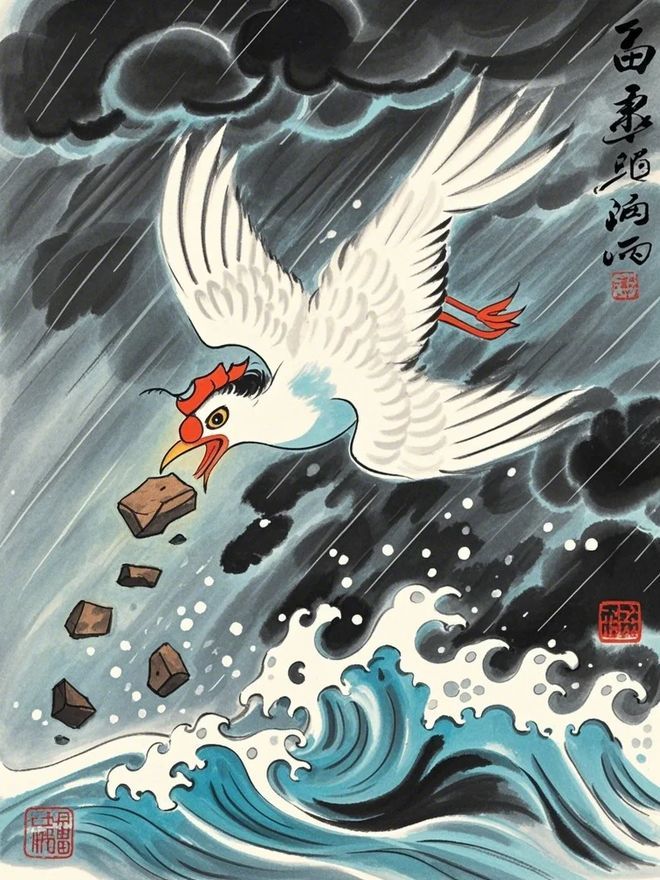 精卫衔草石由发鸠山飞往东海投入,誓言要填平东海。晋代陶渊明诗曰:精卫衔微木,将以填沧海。后人常用“精卫填海”这句成语,比喻既定永恒目标,更有坚韧不拔的精神为后盾。