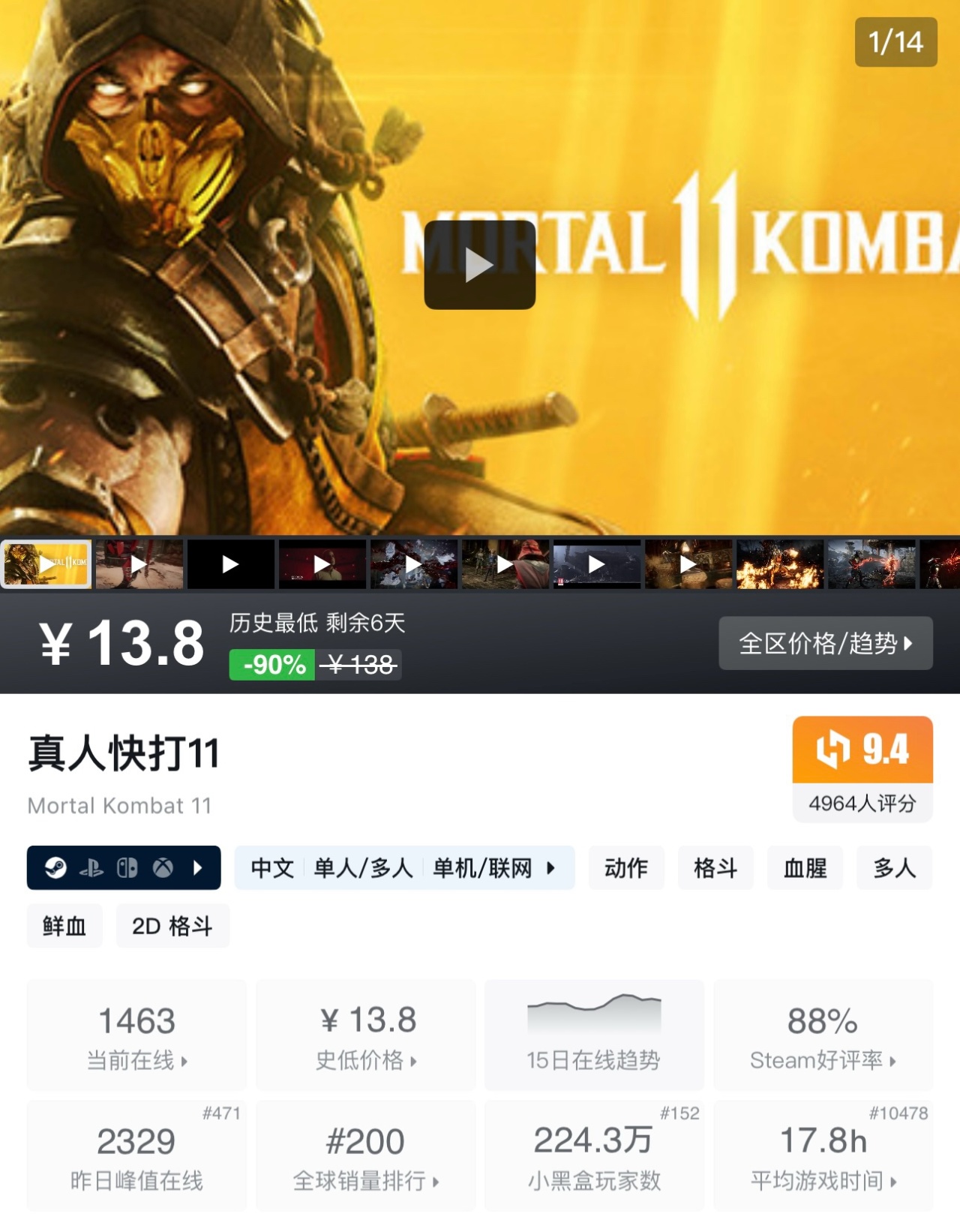 《真人快打11》是一款以極致暴力美學著稱的格鬥遊戲,擁有深度角色養成與豐富劇情,玩家可操控經典角色施展血腥終結技,在快節奏對戰中體驗硬核格鬥的刺激與爽感。