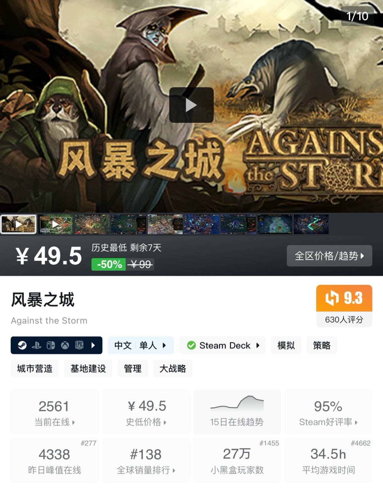 風暴之城》是一款Roguelite式城市建造模擬遊戲。玩家將扮演總督,奉焦枯女王之命,帶領人類、海狸等奇幻種族在枯萎風暴後的荒野中開拓定居點,構建龐大的定居點網絡,同時要應對荒野危險與風暴威脅,並可將前次征程的資源、經驗等沿用到新的征途中。