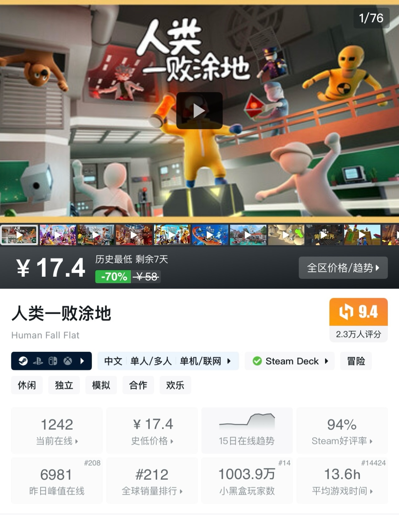 《人類一敗塗地》是一款基於物理引擎的搞笑解謎類多人遊戲,玩家操控笨手笨腳的橡膠人,在荒誕場景中通過合作或獨自破解機關,體驗充滿意外與歡樂的闖關過程。