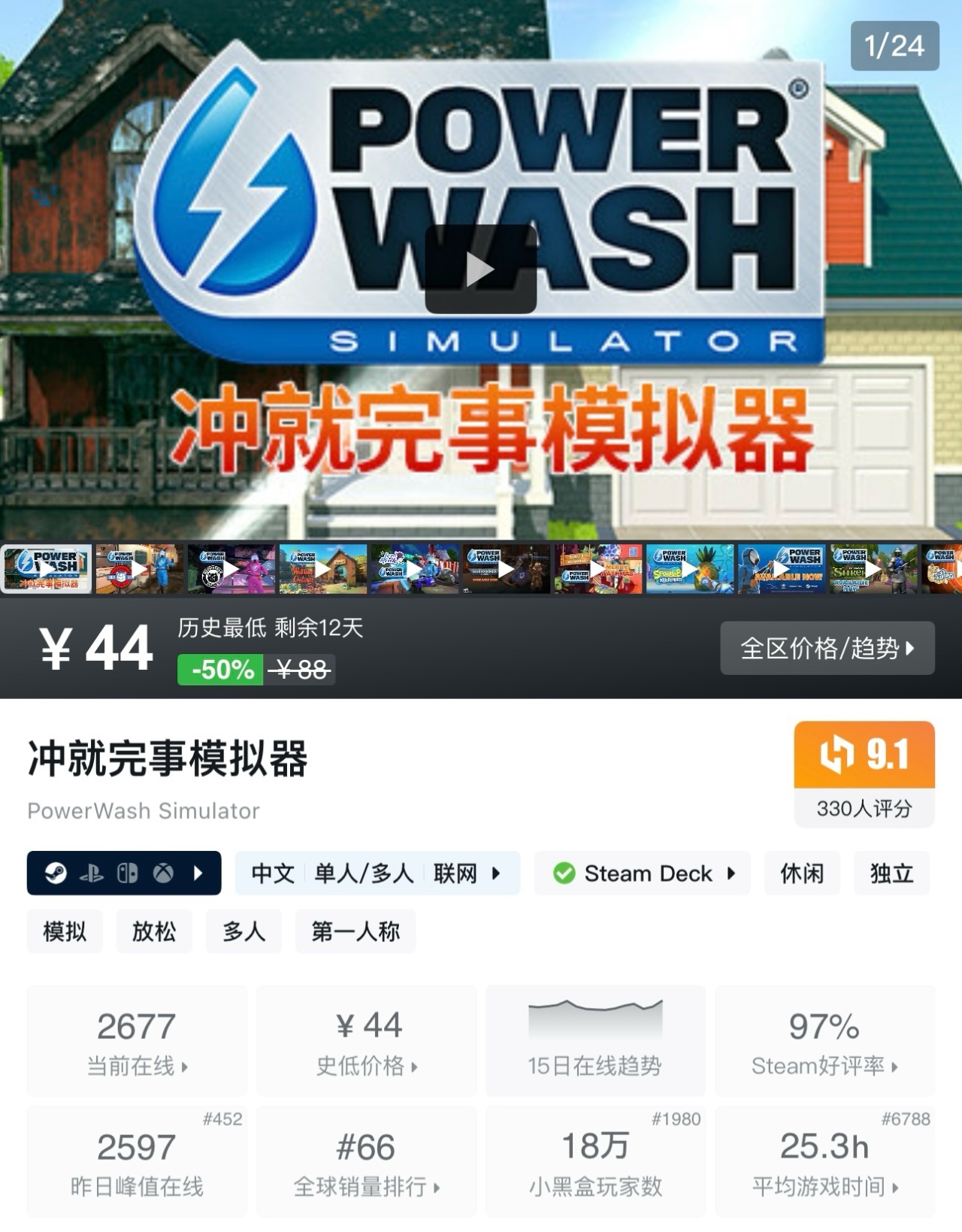《衝就完事模擬器》是一款休閒解壓的模擬遊戲,玩家將扮演清潔工,使用高壓水槍清洗汽車、房屋等各種設施和場景,通過完成清潔任務來賺取金錢,還可體驗單人模式或多人合作模式的樂趣。