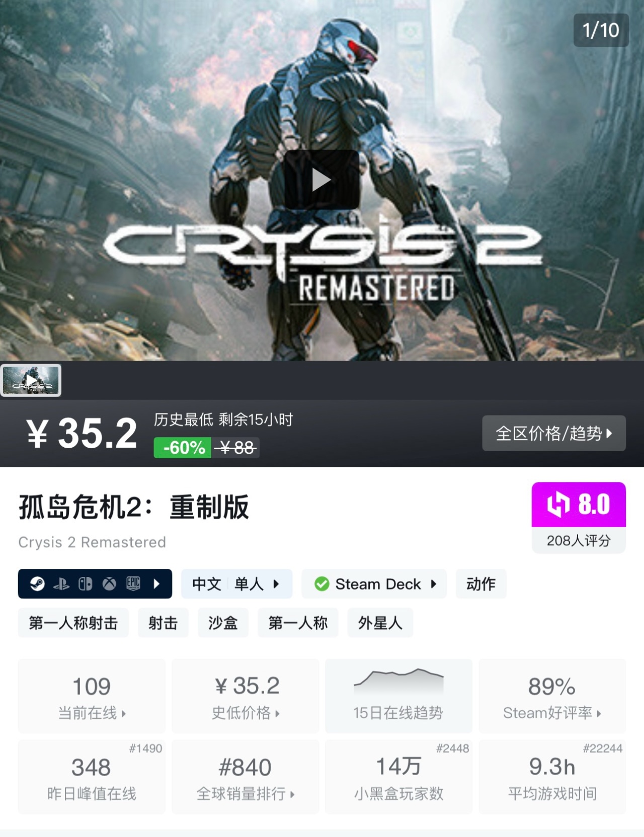 《孤島危機2重製版》是一款以科幻爲主題的第一人稱射擊遊戲,它憑藉光線追蹤等技術帶來了極致視覺體驗,讓玩家身着納米戰衣在被外星入侵後的紐約廢墟中與敵人激戰,感受緊張刺激的城市戰爭。