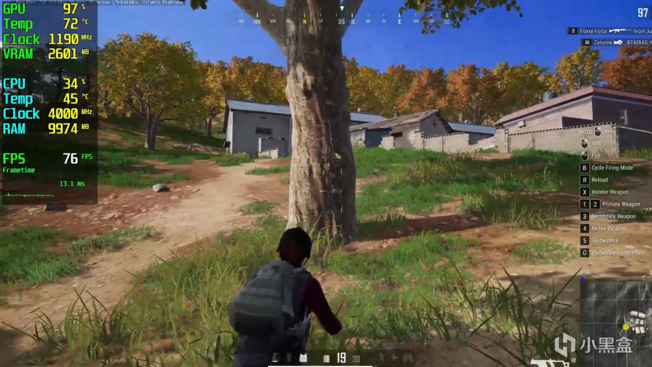 然后是吃鸡 1080P低画质,室内搜点的时候帧数稍微会更高点,能有个8~90帧,不过当来到野外,大场景渲染的情况下,帧数就会爆降很多,在与人对枪时甚至是能跌破到60多帧。