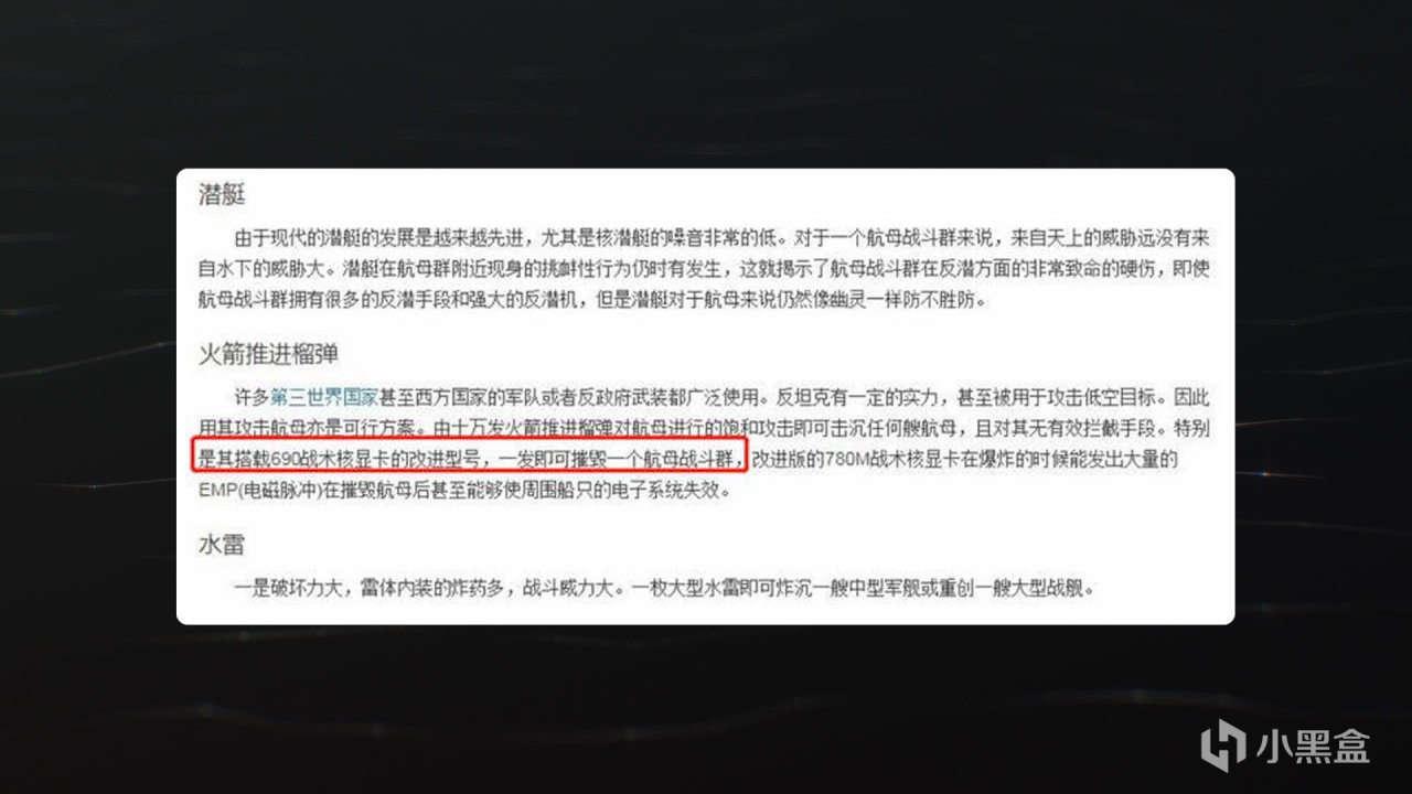 当网友看到GTX 690这功耗,就在“航母杀手”相关词条中恶搞,将 GTX 690 描述为一种“火箭推进榴弹-690战术核显卡”,并声称“一发就能摧毁一个航母战斗群”