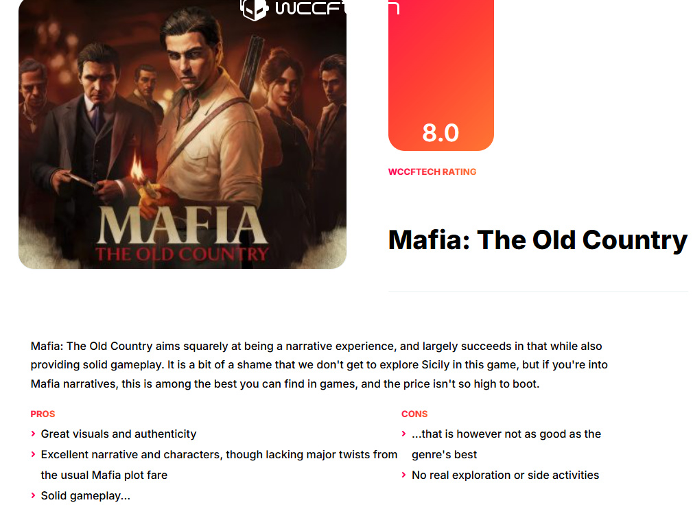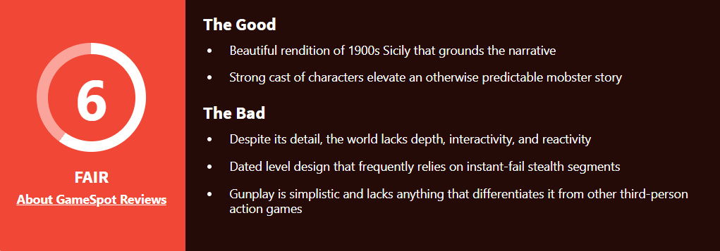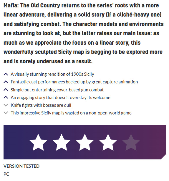 《四海兄弟:故乡》以回归系列本源的线性冒险模式,呈现了一个扎实(尽管充满陈词滥调)的故事与令人满意的战斗系统。角色模型与环境建模令人叹为观止,但正是后者引出了本作的主要问题:虽然我们赞赏其对线性叙事的专注,但这个精心雕琢的西西里地图实在令人忍不住想要深入探索——作为非开放世界游戏,这片瑰丽的土地显然未被充分利用。