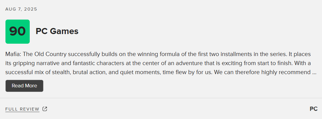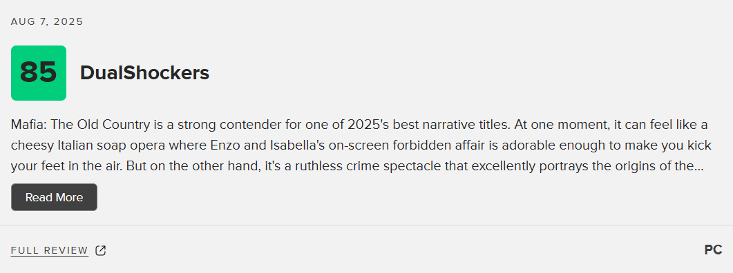 《四海兄弟:故乡》将正式于8月8日发售,根据评分网站Metacritic的整理,目前有51家媒体评分,多家媒体如Impulsegamer、PC Games、DualShockers评价《四海兄弟:故乡》电影级剧本张力、刀械格斗与多变枪战带来新鲜感、14章节剧情节奏精准给出了9.8/9/8.5分的评价;IGN/GameSpot则认为玩法缺乏突破,游戏精美外壳包裹着过时的任务设计,分别给出了8/6分的评价。