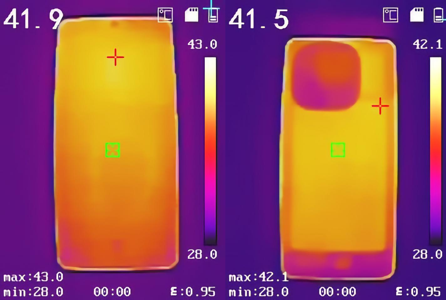 30分钟后,机身正面最高温度为44.7℃,背面最高温度为42.9℃。