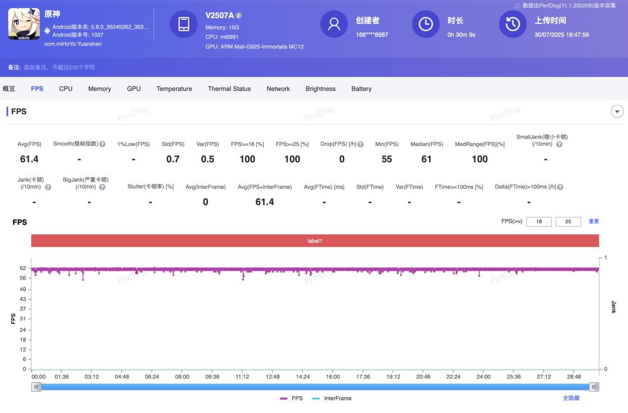 同样是高画质,《原神》须弥城内跑图半小时,画面平均帧率为61.4 FPS,可以说毫无压力。