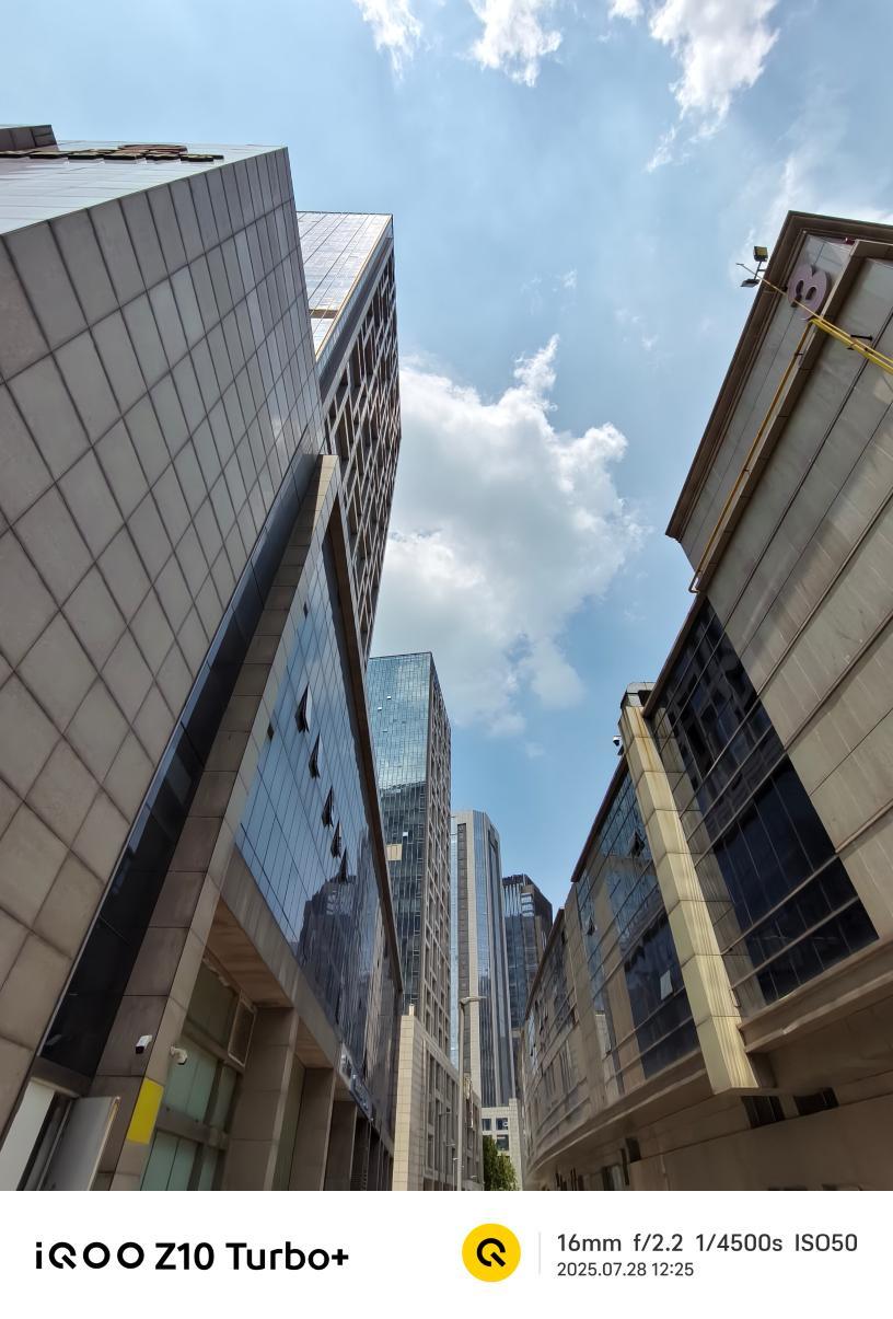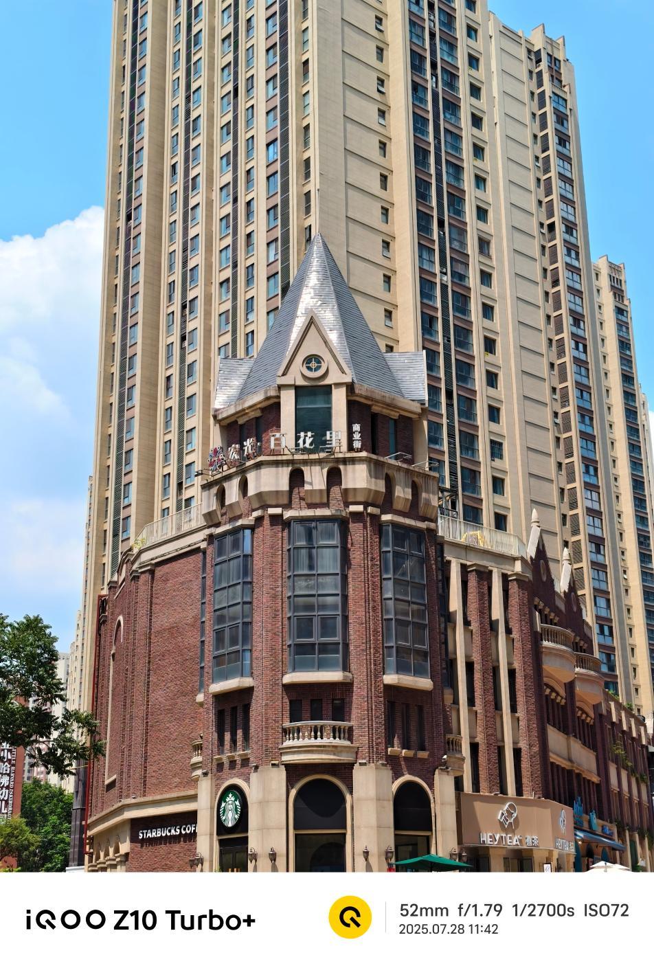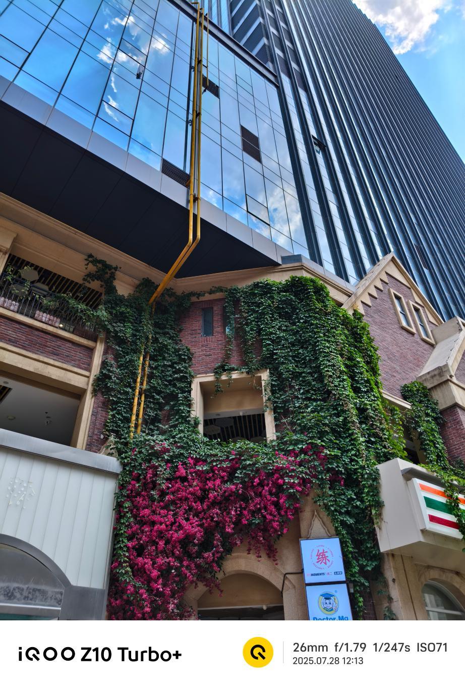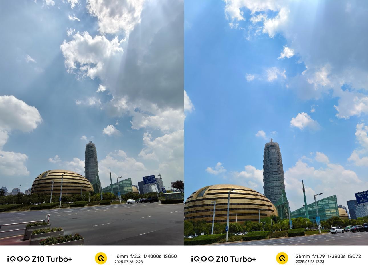 白天光线充足的情况下,同一角度,分别使用0.6x超广角和1x主摄拍摄玉米楼,可以看到,两张照片存在明显的色差。也就是说两个焦段之间没有做色彩统一,而且主摄颜色过于鲜艳,观感有些奇怪,超广角则是暗淡无光,颜色有些发灰。