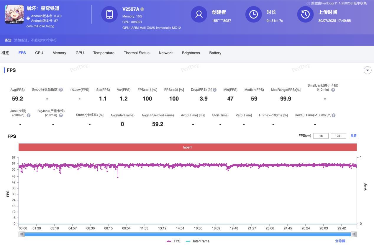 高画质下,《崩坏:星穹铁道》匹诺康尼黄金的时刻跑图半小时,画面平均帧率为59.2 FPS。跑图过程中,部分场景偶尔出现卡顿,但是整体玩下来还是很流畅的。