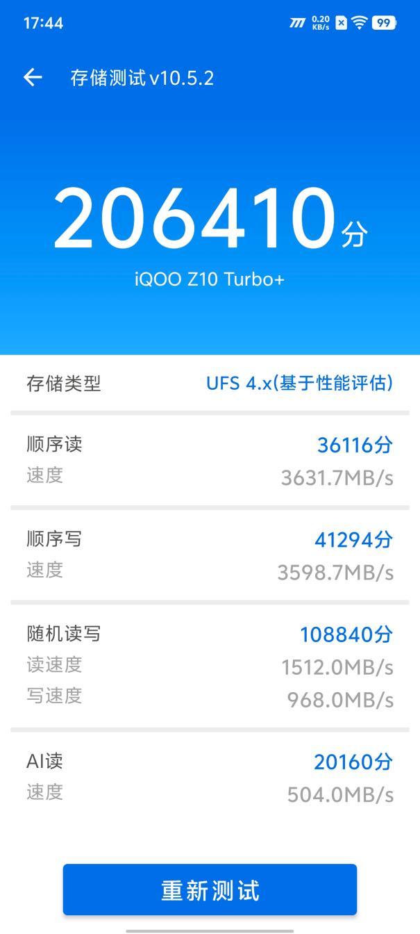 当然,iQOO Z10 Turbo+存储成绩也很不错,总成绩为206410分。其中,顺序读36116分,速度为3631.7MB/s;顺序写41294分,速度为3598.7MB/s;随机读写108840分,读速度为1512.0MB/s,写速度为968.0MB/s;AI读20160分,速度为504MB/s。