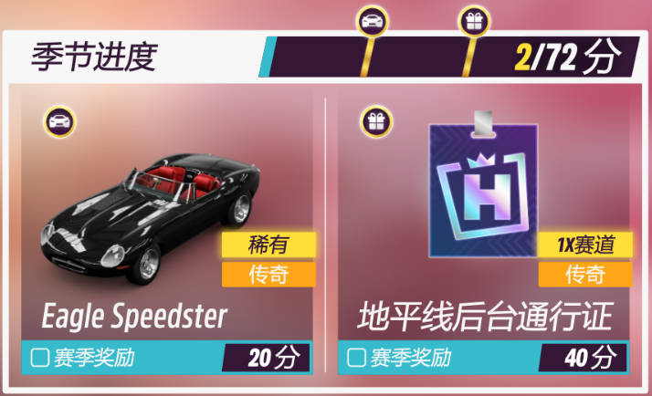 春季賽20分進度獎勵爲2012款EAGLE SPEEDSTER和40分進度獎勵爲地平線後臺通行證
