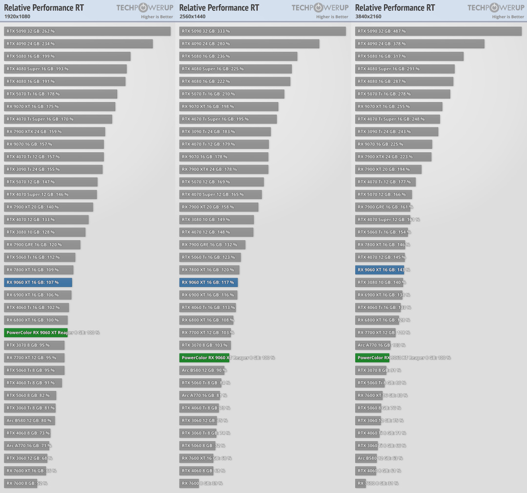 TechPowerUp光追(RT)綜合性能彙總,基準:RX9060XT