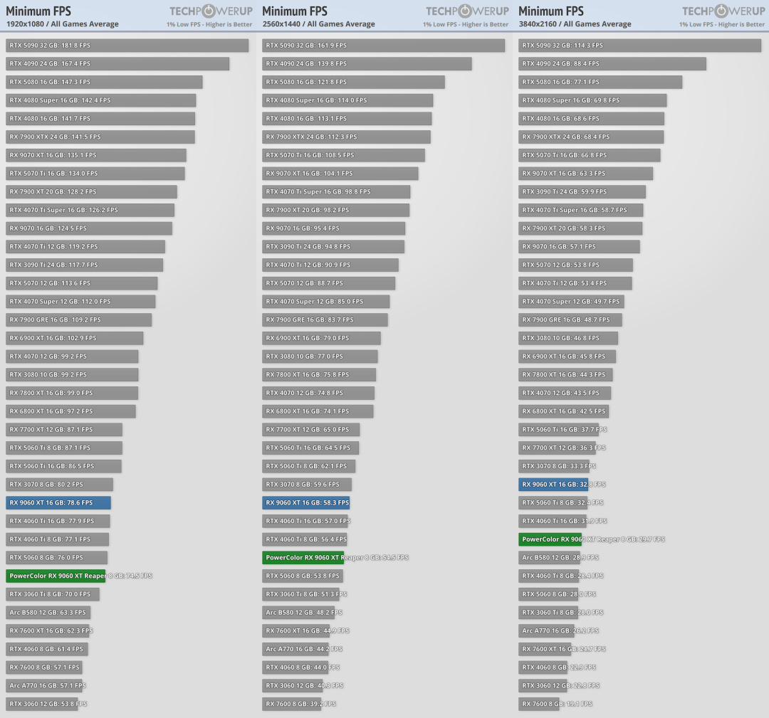 TechPowerUp遊戲LOW幀彙總,基準:RX9060XT