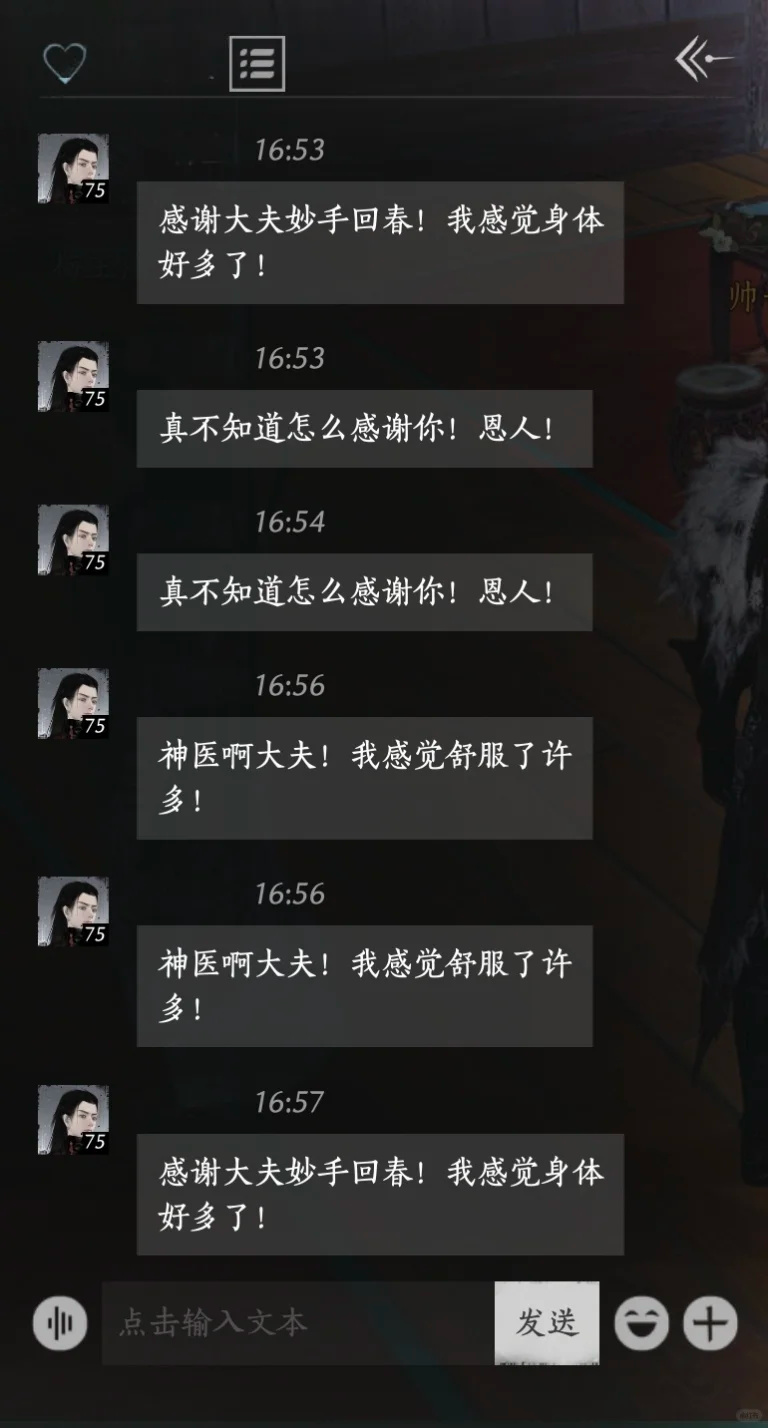 任务中,玩家可以帮助NPC或者其他玩家看病。如果治疗成功后,患者给医生点赞的话,会自动发送“感谢大夫妙手回春!我感觉身体好多了!”“神医啊大夫!我感觉舒服了许多!”诸如此类的发言。