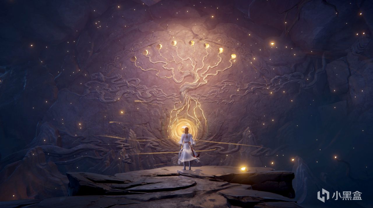 除了云海探索外,《代号:逍遥游》还设计了“神识”系统,在PV中同样有展示。主角在施法后,类似“开了天眼”,将墙壁上的文字和符文缓慢显现出来,并打开了通往另一个场景的入口。在体验感受上,区别于不少产品从A点到B点的直接传送,神识的场景探索更具修仙体验的仪式感和代入感。从施法后镜头一荡的视觉转换;到墙上文字泛出金光的缓慢浮现;符文由新月到满月的解锁;最终主角悬空进入到金色光晕。