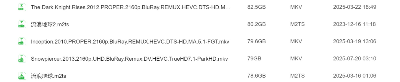 片源再好點,BD-4K大多也就在2—30GB的容量,BD原盤基本上就接近4K原盤的容量,普遍在50GB往上。嚴格意義上的影院同款規格,即真正的原盤,一部電影得100GB往上,甚至2—300GB/部,這類資源就比較稀缺了。