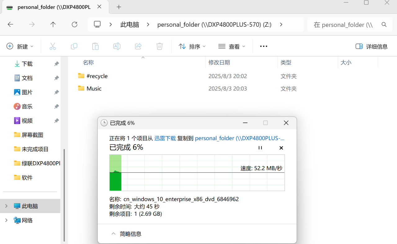 文件拷貝速度也取決於路由器+硬盤性能,以本人的古早路由器爲例:無線50MB/S,有線100MB/S,就是一個常規千兆規格。