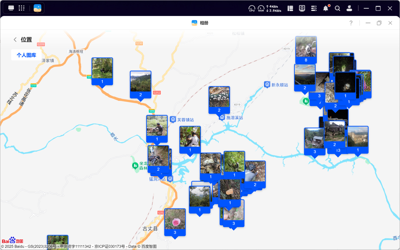 個人用的比較多的是“相冊位置標註”功能,以往野外考察工作照即可標註在地圖上,比較方便後續歸檔與交流。例如小溪考察目標是尋找矛頭蝮蛇,那帶有地理位置信息的相關照片即可明確標註在拍照點。