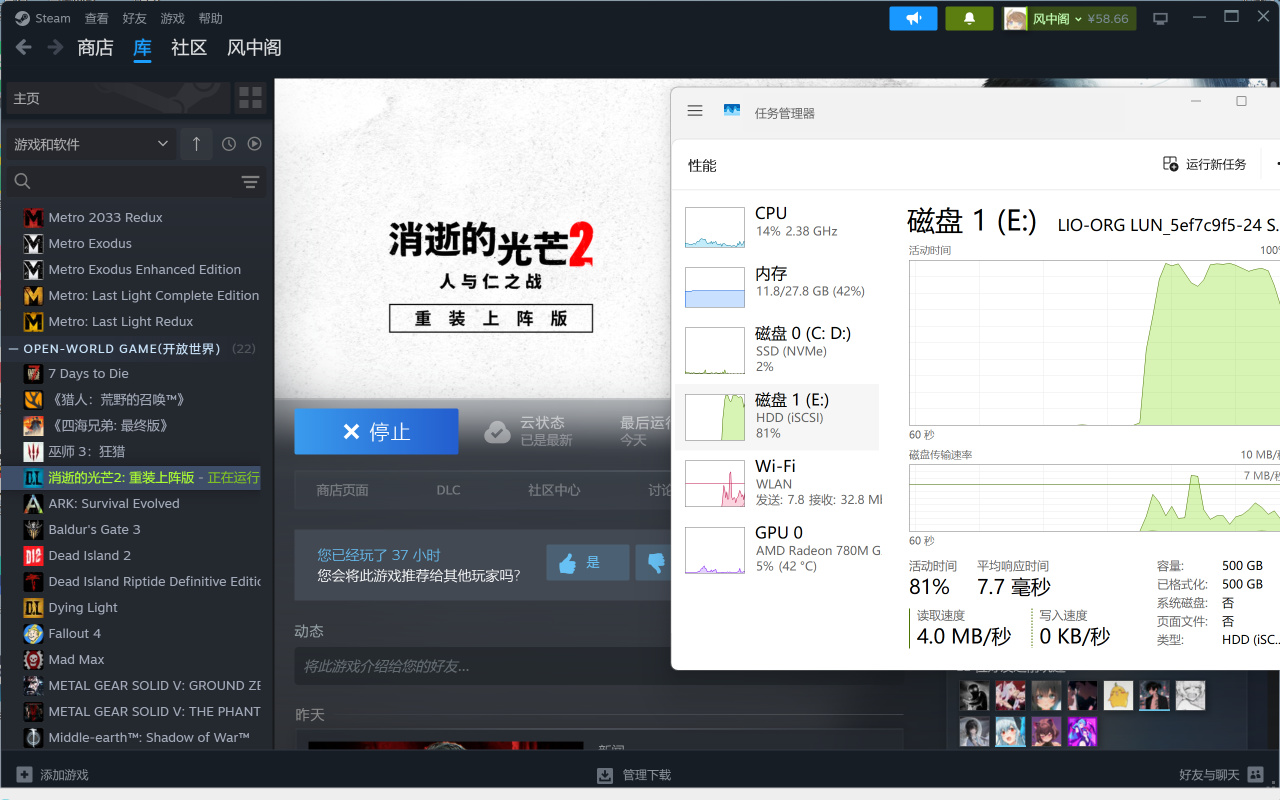 以72GB容量的《消逝的光芒2》爲例,Steam可正常在磁盤中建立文件庫,並且安裝遊戲文件。