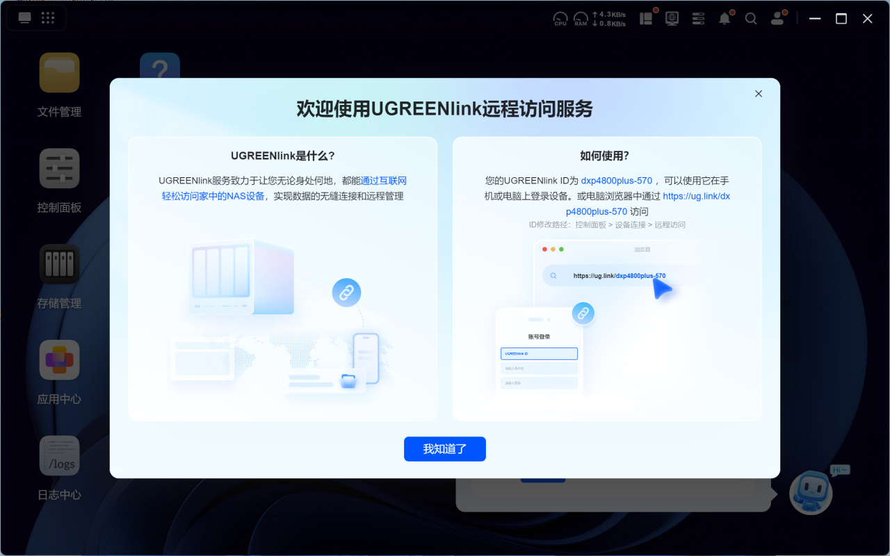 最後就是開啓UGLink遠程訪問功能,原理是通過綠聯服務器輔助P2P轉發,讓外部網絡設備能夠訪問NAS,不用考慮自己搭個服務器用於轉發穿透。
