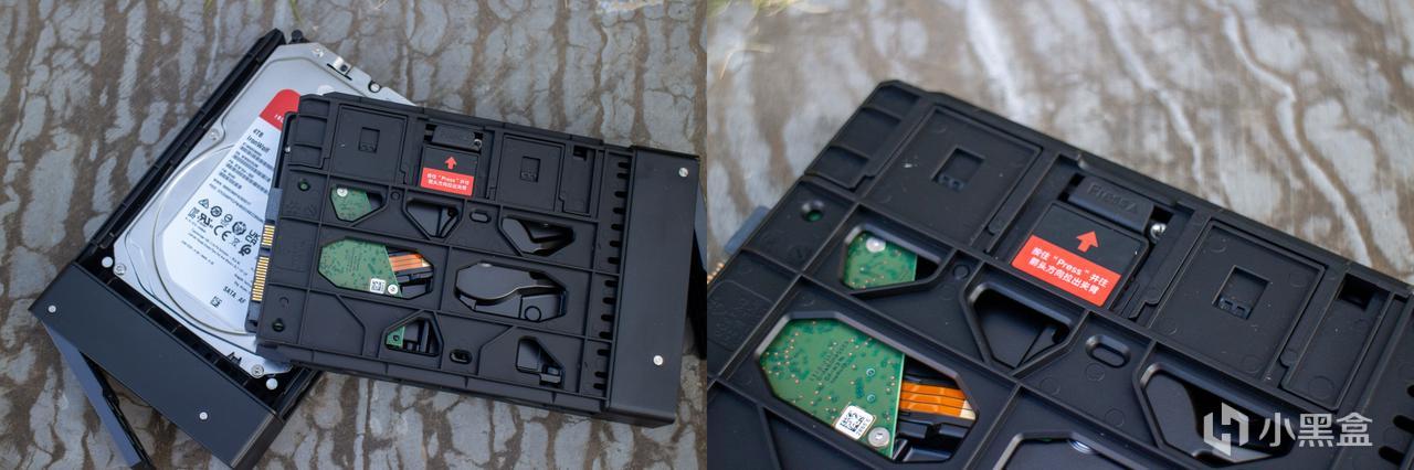 設計硬盤支架免螺絲固定的人簡直是天才!這算是DXP系列的一個極大優勢,安裝和更換硬盤十分方便,下到1TB薄盤,上到30TB超厚氦氣盤,都能正常安裝固定。