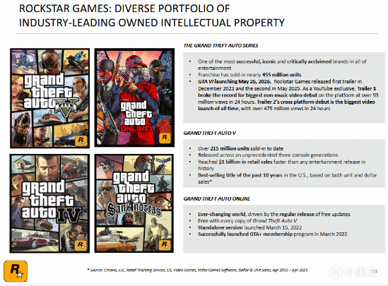 2. 8月7日,Take-Two公布了2026财年第一财季(涵盖2025年4月1日至6月30日)的财务业绩,其中确认旗下人气游戏《GTA5》与《荒野大镖客:救赎2》的销量已经分别达到2.15亿份与7700万份。据推主@GTA6Intel发布的消息报道,在Take-Two未来新作发售安排的幻灯片里,Take-Two确认《GTA6》仍旧将于2026年5月26日发售。来源:游民星空