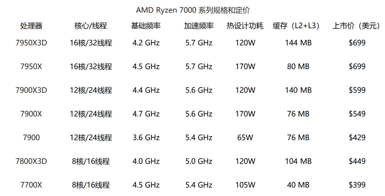對比沒有堆疊緩存的型號,7900X3D 和 7800X3D 要貴上 50 美元,而 7950X3D 則和 7950X 首發的 699 美元保持一致。