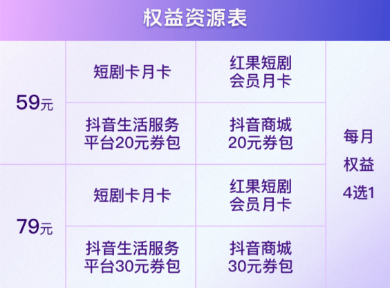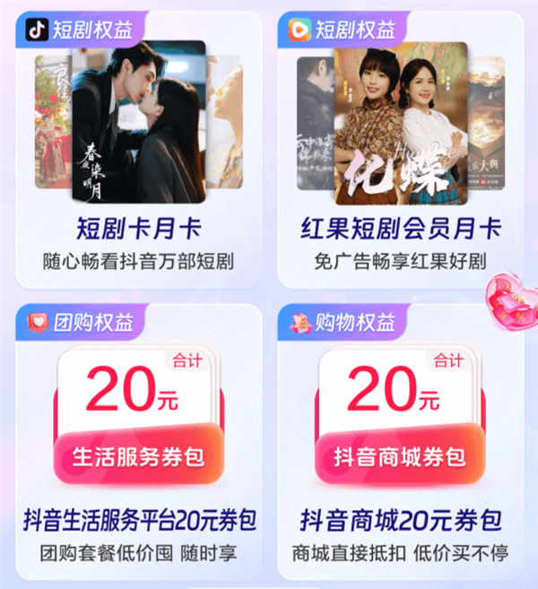 两档均有全国亲情网基础功能费减免及抖音热门权益4选1:短剧会员卡月卡;红果短剧会员月卡;抖音商城20/30元券包;抖音生活服务平台20/30元券包。