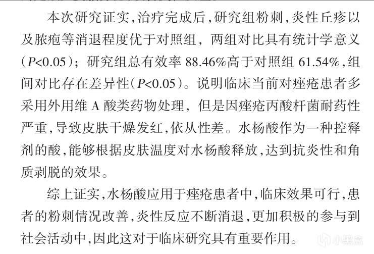 结论:治疗完成后,研究组粉刺, 炎性丘疹以及脓疱等消退程度优于对照组,两组对比后可得痤疮患者行水杨酸治疗,其总有效率有效提升,面部炎性反应消退。