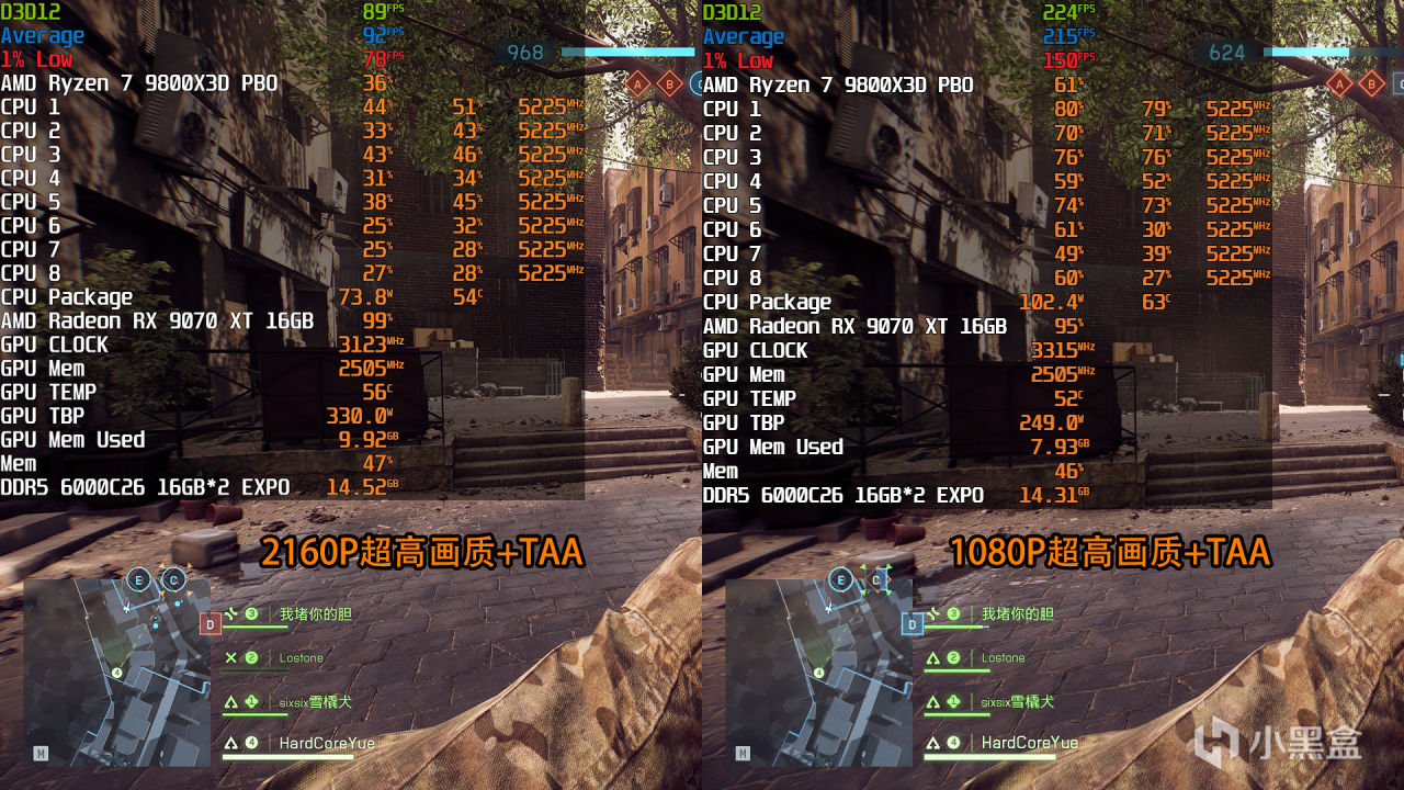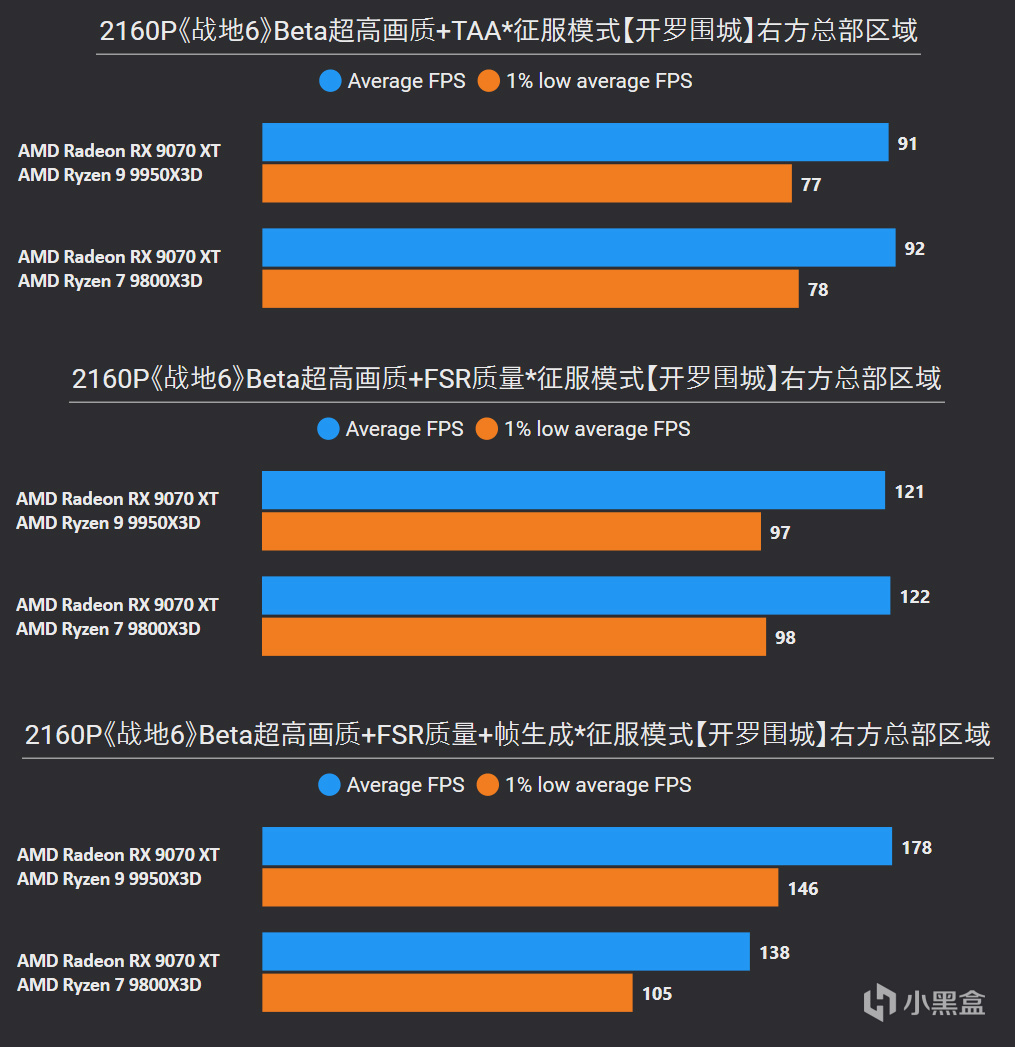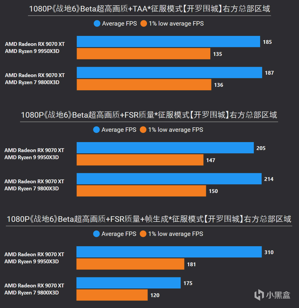 從以上結果不難看出,三種分辨率下,TAA和FSR設置9950X3D和9800X3D幀數表現都是差不多的水平,也充分說明雙CCD調度沒有問題。最大差距出現在疊加幀生成,額外生成的兩倍幀對於9800X3D會造成巨大壓力,直接暴露瓶頸狀態。