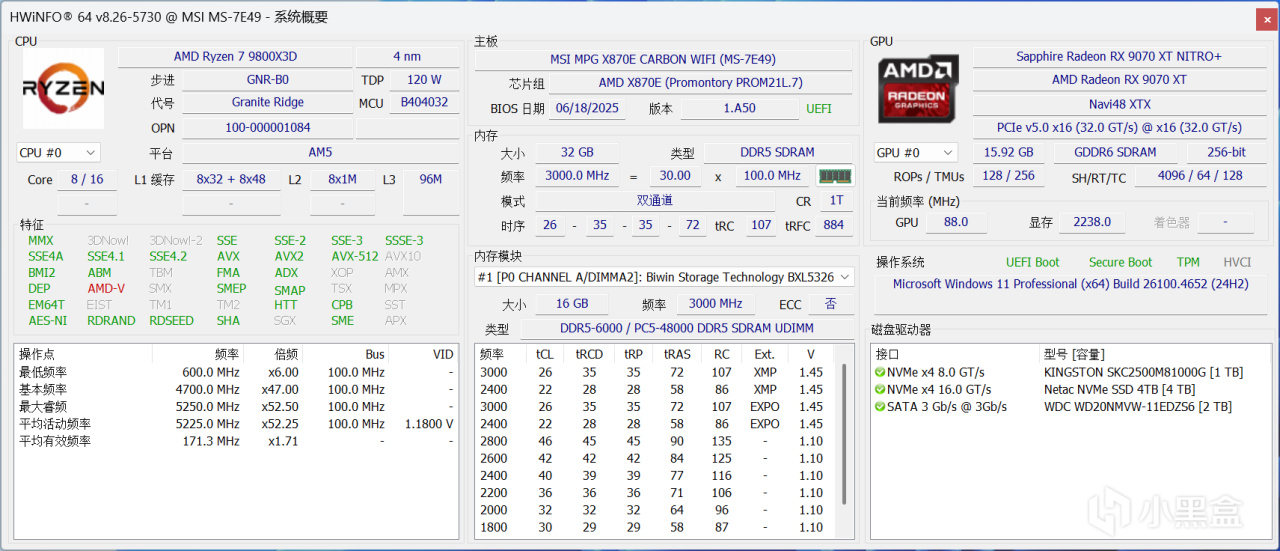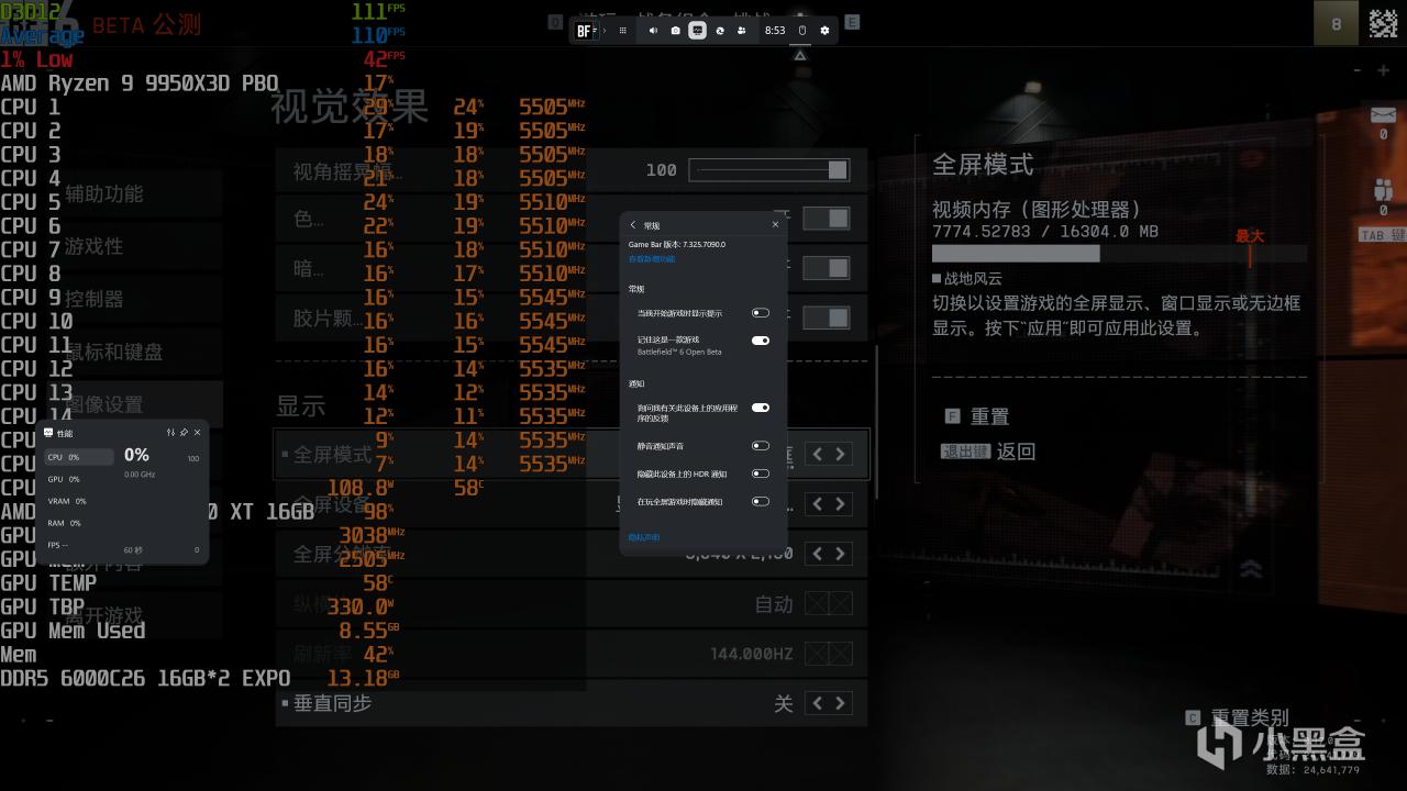 考慮到《戰地6》128人征服模式可能對於CPU性能要求極爲苛刻,本次CPU直接上大滿貫的銳龍9 9950X3D最大程度降低CPU瓶頸,設置PBO ENABLE,主板是微星MPG X870E CARBON WIFI暗黑,搭配兩根DDR5 6000C26 16*2內存套裝,操作系統是Windows 24H2最新版本,搭載顯卡驅動是AMD Adrenalin 25.8.1 WHQL最新版本,對《戰地6》BETA版有針對性優化。