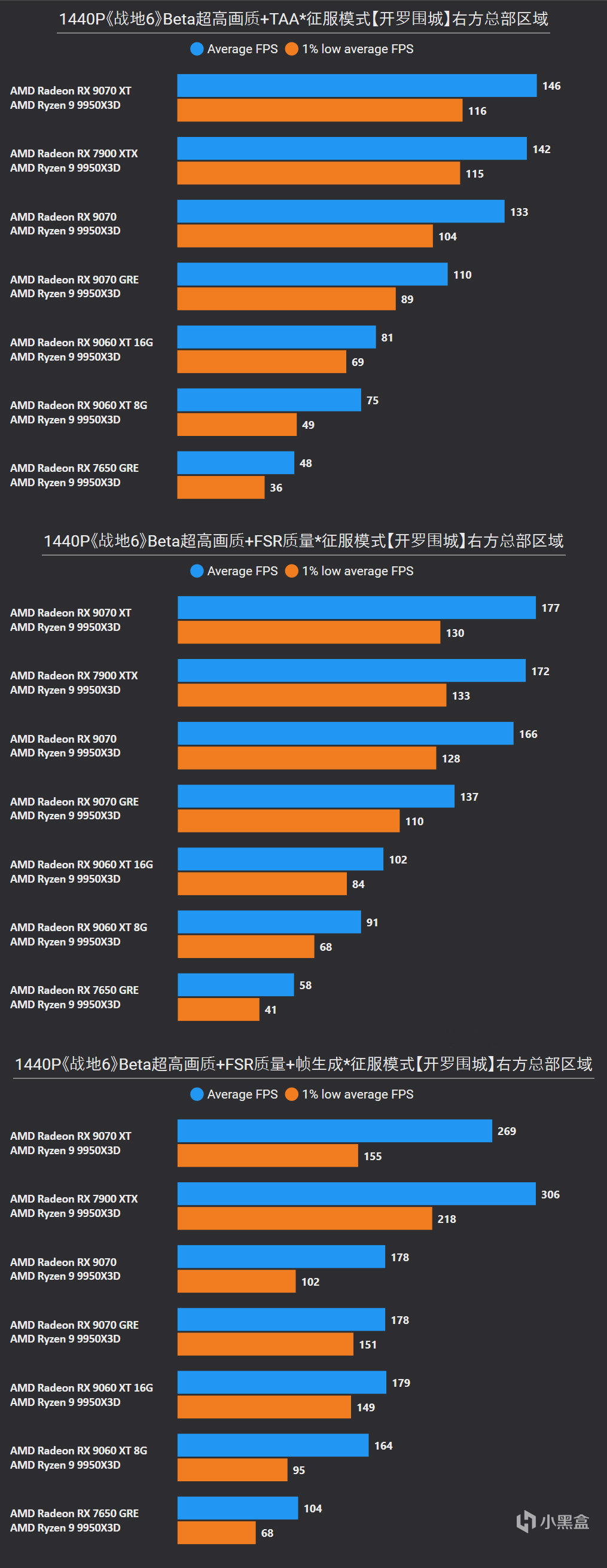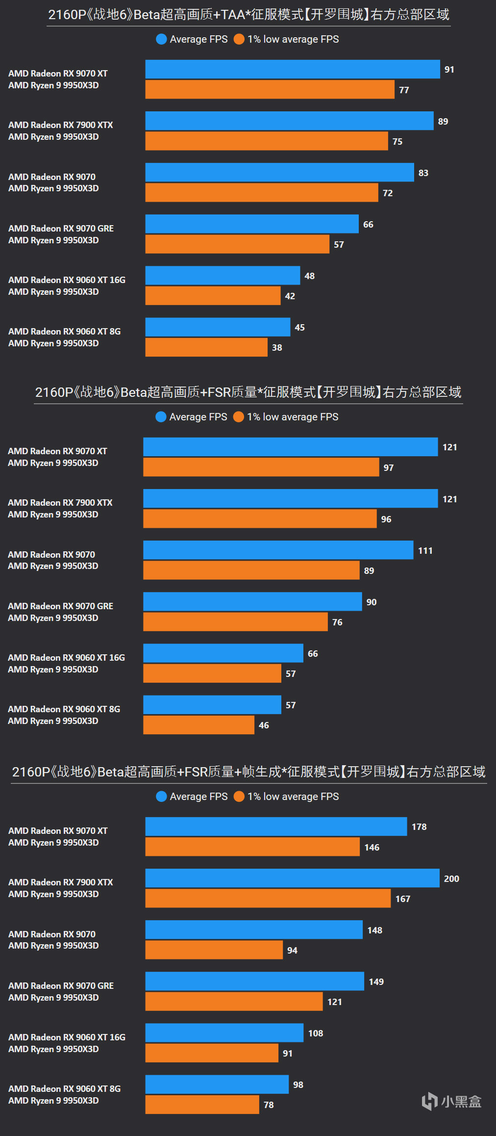 9070 XT、9070和7900 XTX三者都是可以完美勝任高刷,尤其7900 XTX開啓幀生成後是最強的,能和9070 XT拉開14%差距。