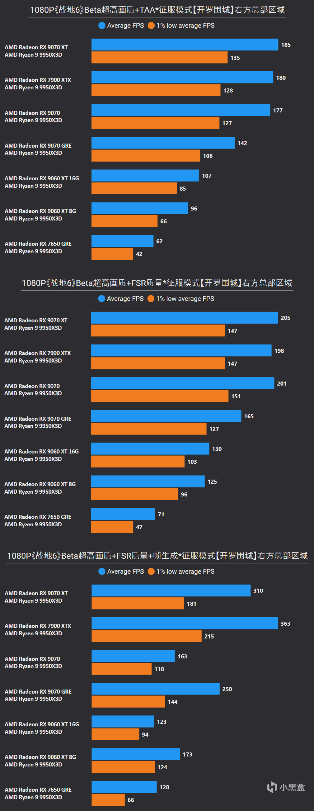不過在本次幀生成測試中,9060 XT 16G(僅1080P)、9070和9070 GRE(僅2K)開啓幀生成後,幀率表現會有異常,畢竟現在只是BETA版也能理解,下面也有出現就不再多提了。