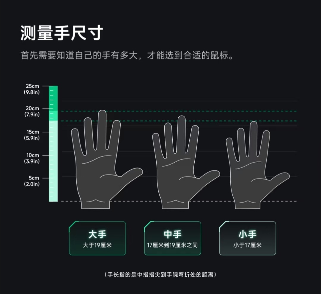 一般來說,手長小於17cm適合中小尺寸鼠標;手長17 - 19cm,選擇中等尺寸鼠標較爲合適;手長大於19cm,建議選擇大尺寸鼠標。