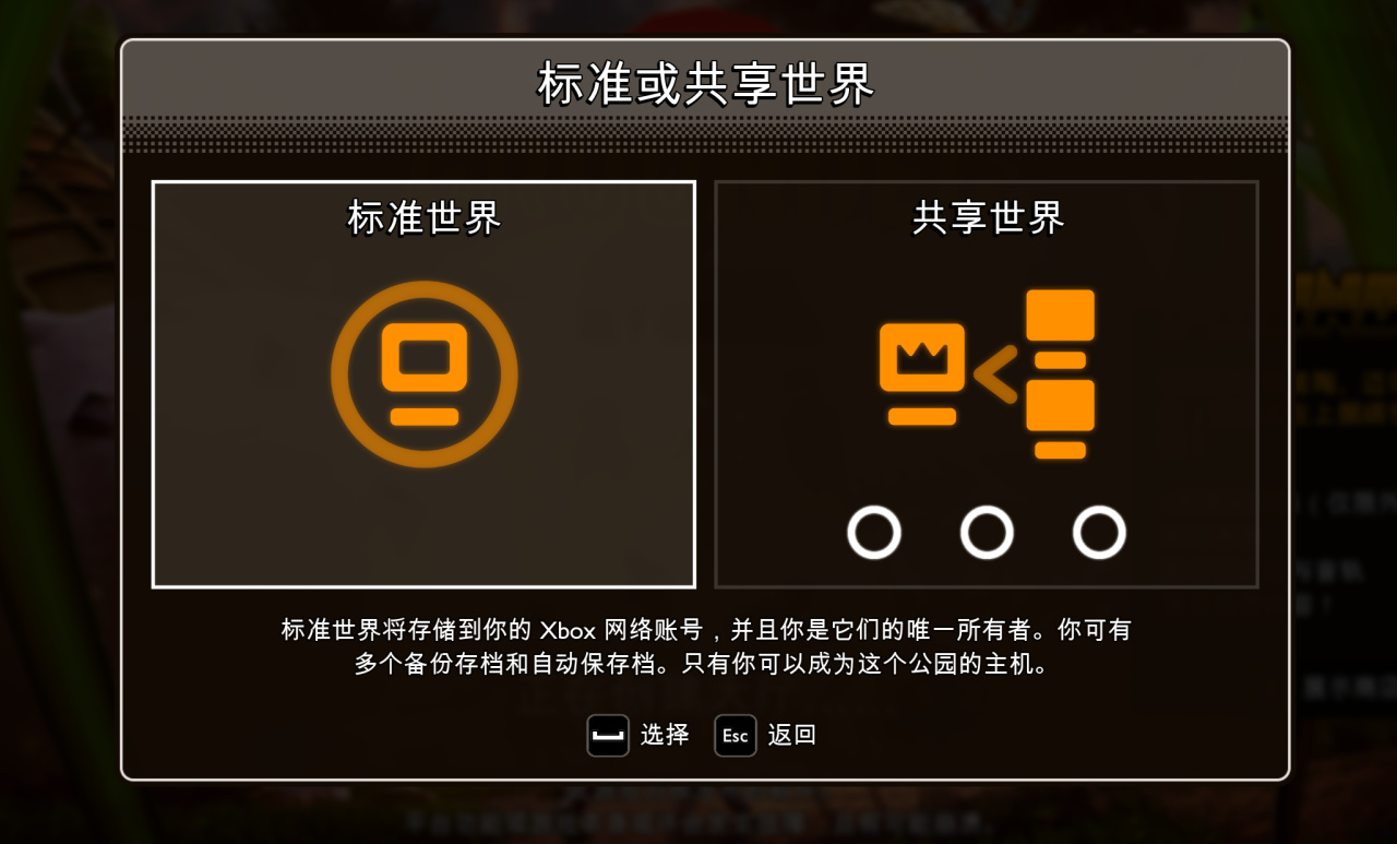 而另一个很重要的选择就是标准世界和共享世界,共享世界是本作新加入的一个联机的方式,我个人理解就是将存档保存在两个人的主机当中,不过这种保存的方式其实是有概率导致存档的损坏的,我一开始和别人玩共享世界,结果存档经常进不去,现在网上也有一些解决方案,如果还是想共享的朋友可以搜一下。