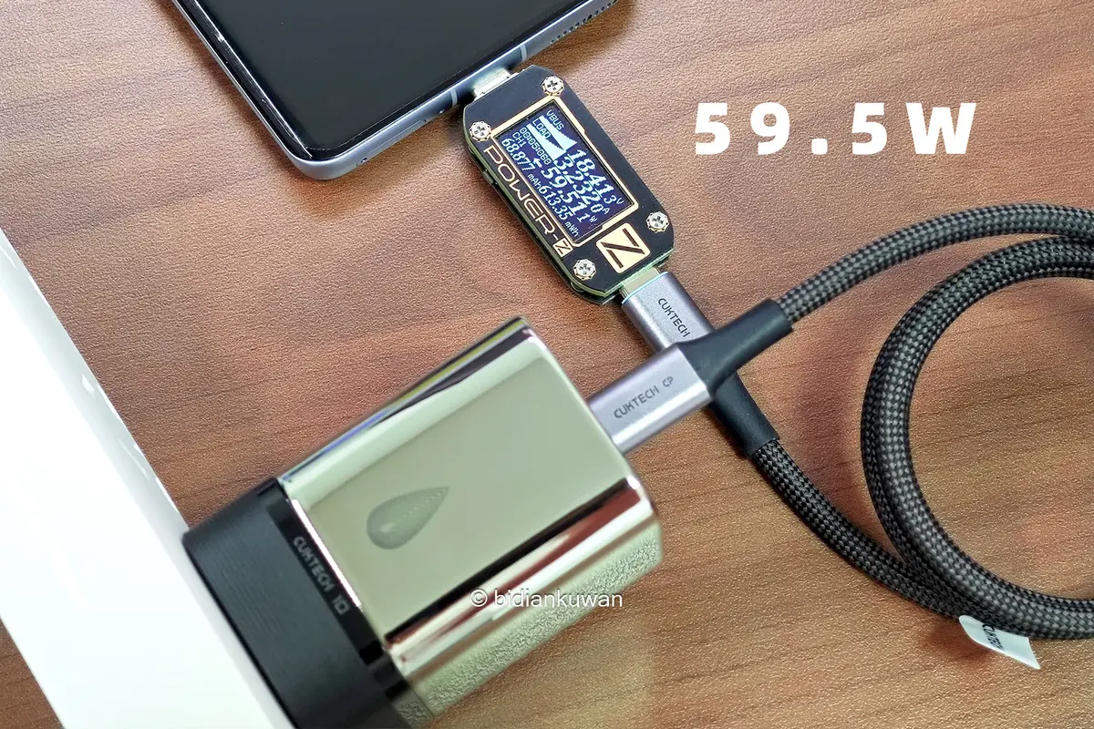 ▼单C1或单C2口给支持120W Max的小米12 Pro手机充电,手机电量40%~50%,输出功率稳定在60W左右。