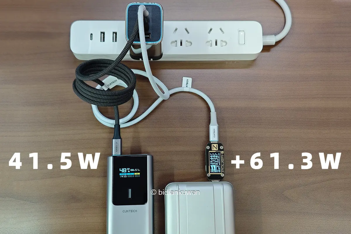 ▼双C口同时输出测试,被充对象分别是酷态科10号和征拓SuperTank Pro这两个充电宝,下图实时分配功率为61.3W+41.5W。